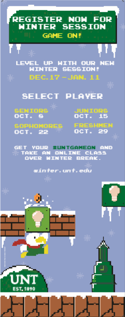 The 2019 Game On campaign was designed to remind attending UNT students to register for winter session, spring, summer, and fall semesters. To make registration overall more eye-catching and engaging to the average student, I created the retro video game concept and copy while keeping UNT's brand and storytelling in mind. A full description of the campaign is provided below.